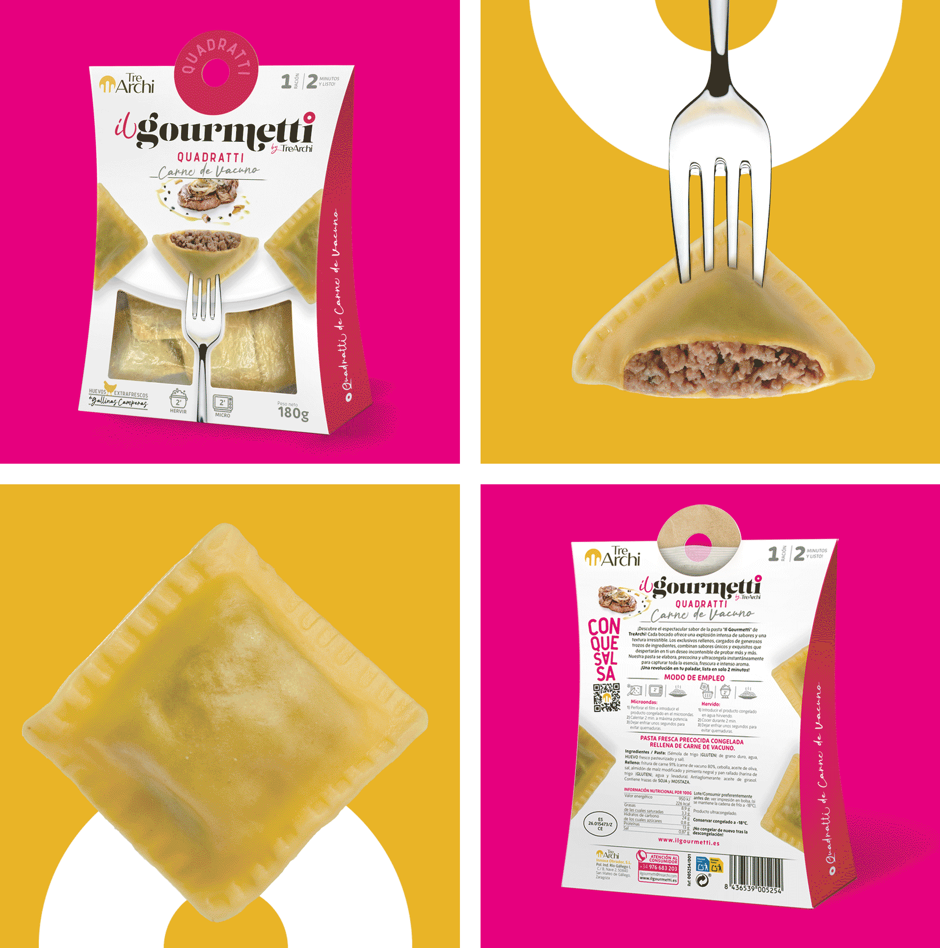 Nuestra propuesta se centró en un diseño que celebrara la naturalidad de la pasta y reforzara la transparencia como eje de comunicación. El envase automontable de cinco caras incorpora un troquel superior que mejora la presencia vertical y añade carácter a la gama. La doble ventana frontal permite ver el producto real, mientras que las barandas laterales ocultan posibles imperfecciones propias del congelado, manteniendo una estética impecable. A nivel visual apostamos por una paleta limpia, acompañada de contrastes cromáticos para diferenciar cada receta y facilitar la identificación rápida en el lineal. La composición incorpora elementos honestos y directos, como el tenedor real y el corte transversal visible, que refuerzan la sensación de producto fresco, auténtico y "recién hecho". El resultado es un packaging que combina funcionalidad técnica, impacto en retail y una narrativa visual coherente con la esencia de Il Gourmetti. Un diseño que marca un nuevo estándar en congelados premium y que ha sido reconocido por su excelencia en los Premios CLAP.